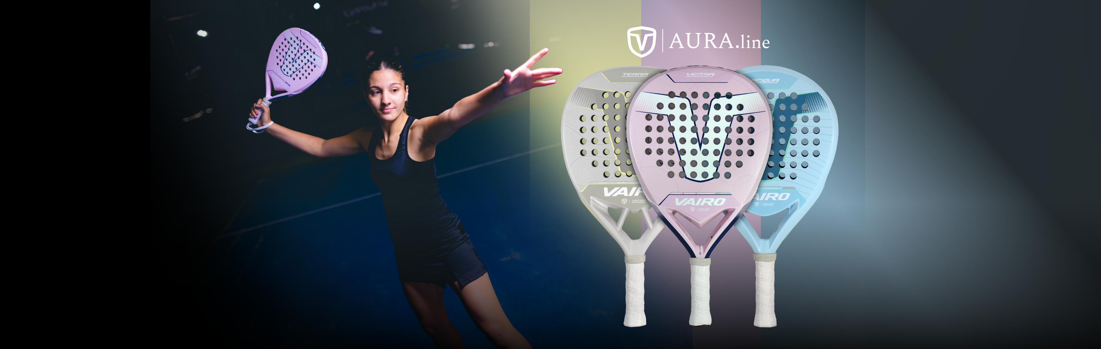 Presentamos Aura Line, nuestra nueva línea de palas diseñada especialmente para jugadoras que buscan un plus en su juego. La colección está compuesta por tres modelos: Terra, en formato híbrido con columnas en el corazón que aportan estabilidad y control; Versa, en formato diamante orientada a la potencia; y Acqua, en formato lágrima, ideal para un equilibrio perfecto entre control y ataque.